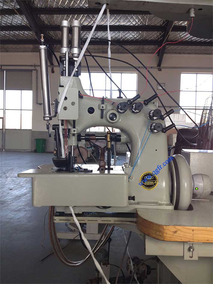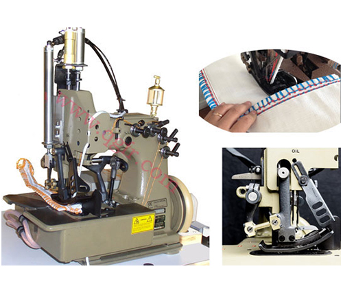 81300 Heavy duty FIBC sewing machine: Heavy duty two needle, four thread safety stitch machine with high needle throw. With top and bottom feed for matched seams on heavy bag fabric. Needle distance 5mm, overedge seam width 19 mm, seam width overall 24 mm. With guide for filler cord from the top and / or below for sealing the needle punctures of the left needle. Electro-pneumatically operated presser foot and upper feed dog lifter. Pneumatic presser foot spring. With built-in electro-pneumatically operated hot thread chain cutter left of the needle for separating the thread chain from below.
