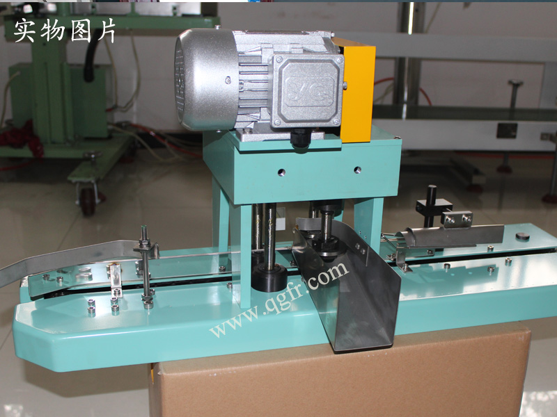 QG4900-3 bags feed-in and trimming device QG4900-3 bags feed-in and trimming device is used to trim the bag top and feed the filled bags into sewing machine. This model is used together with the GK series automatic bag closing sewing machines. After trimming the bag edge, a tape can be bind over the top before sewing.